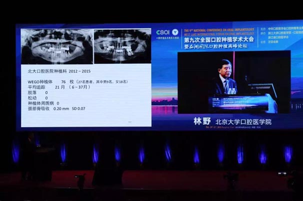 威高演講中林野教授對(duì)國(guó)產(chǎn)品牌WEGO牙種植體系統(tǒng)的設(shè)計(jì)和臨床表現(xiàn)表示肯定,向在座觀眾展示了WEGO牙種植體系統(tǒng)的臨床病例。病例對(duì)76WEGO牙種植體進(jìn)行了平均21個(gè)月的追蹤觀察,結(jié)果表明WEGO牙種植體脫落、松動(dòng)、種植體周?chē)‖F(xiàn)象均為0,頸部骨吸收平均值為0.20mmSD0.07。