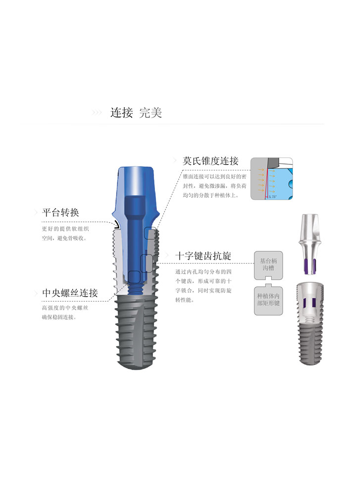 WEGO牙種植體采用了平臺轉(zhuǎn)換、莫氏錐度連接、十字鍵齒抗旋的結(jié)構(gòu)設(shè)計,種植體與基臺通過高強度的中央螺絲穩(wěn)固連接。該結(jié)構(gòu)充分體現(xiàn)了種植體與基臺之間的無間隙密封性能、較強的應(yīng)力分散能力和抗旋性能。